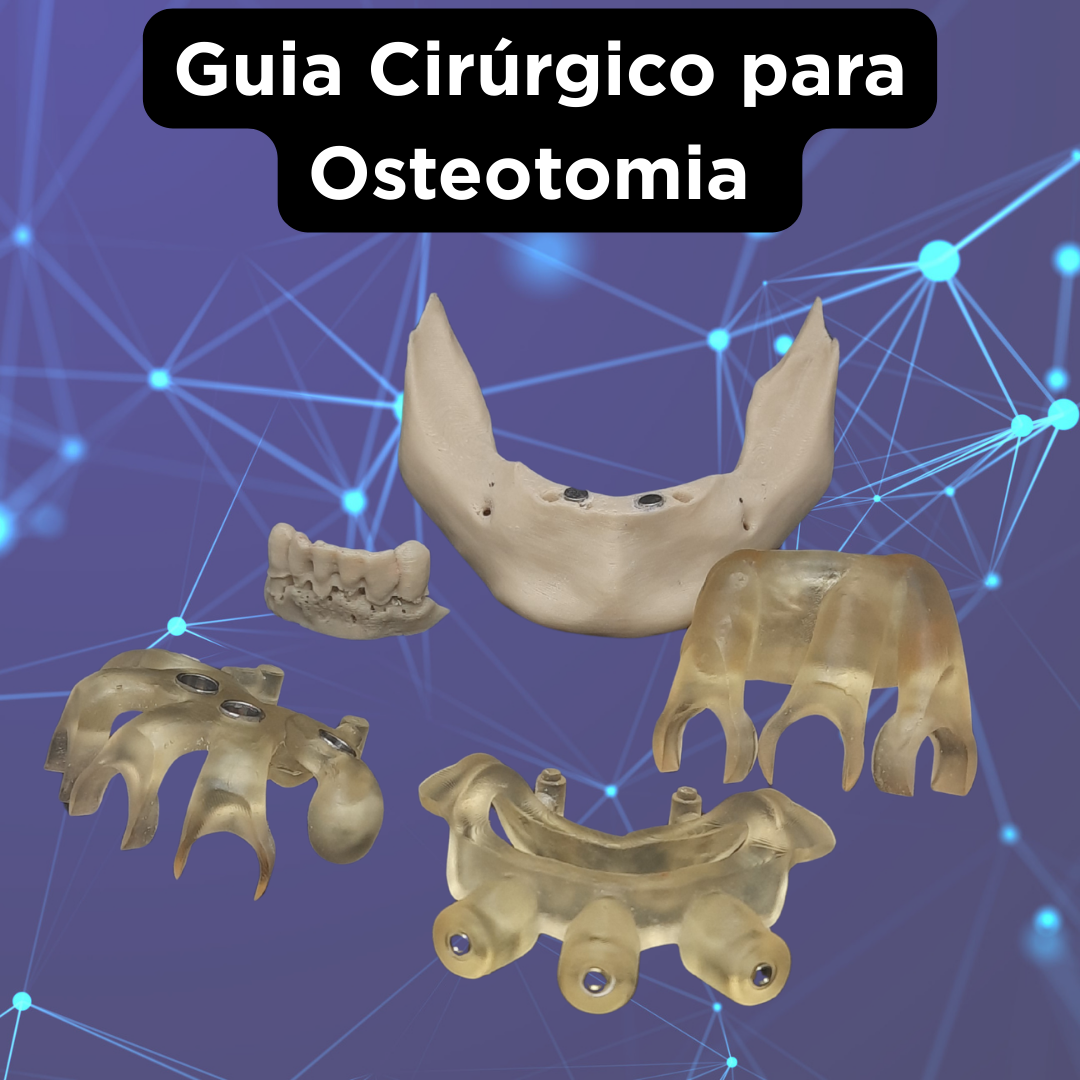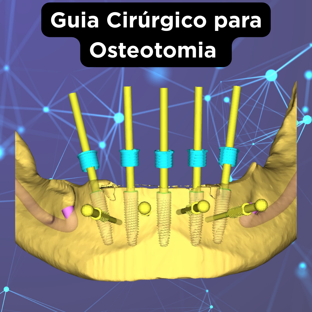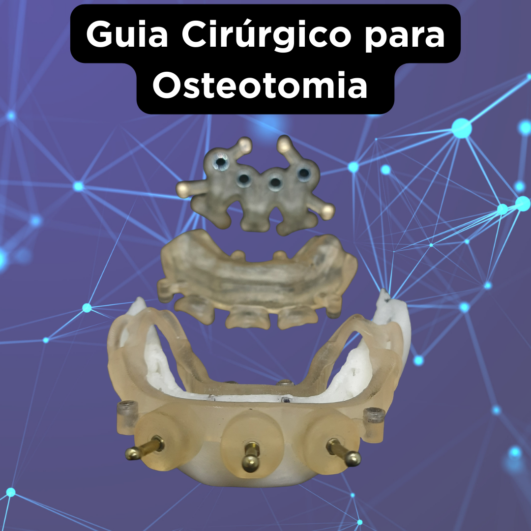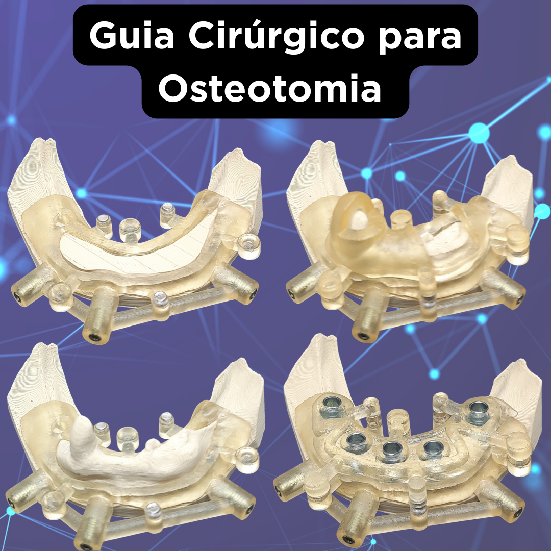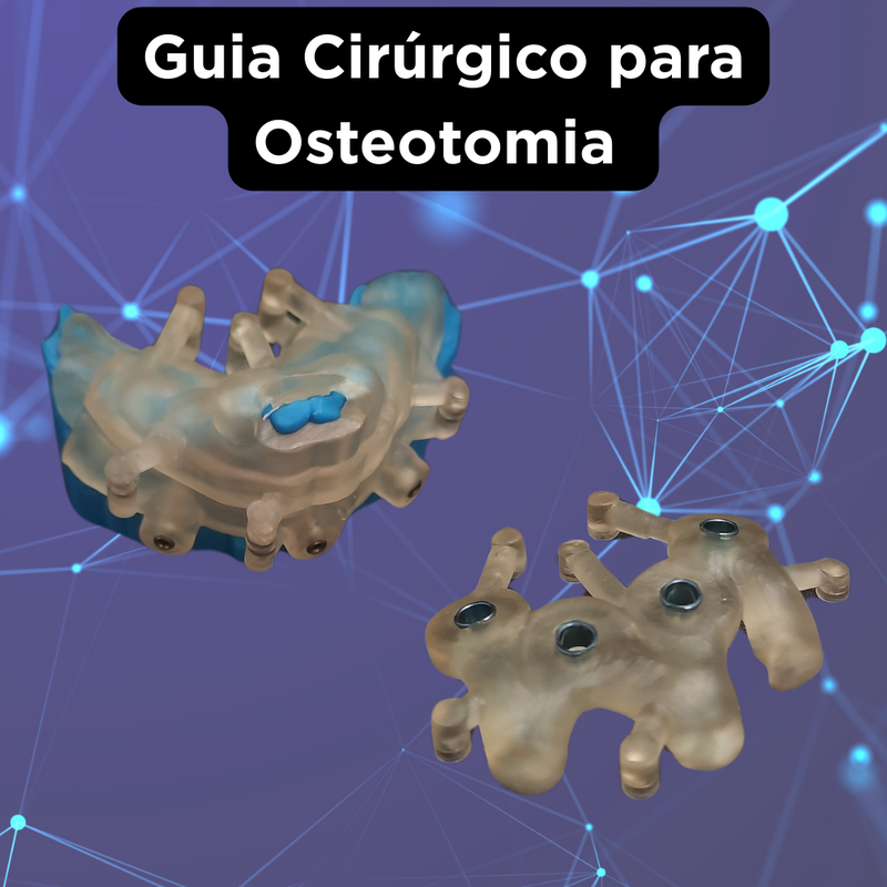 Guia de osteotomia impresso em resina autoclavável com anilhas metálicas e planejamento virtual para cortes ósseos precisos. Indicado para cirurgias avançadas e protocolos complexos. Arquivos necessários: STL e DICOM.